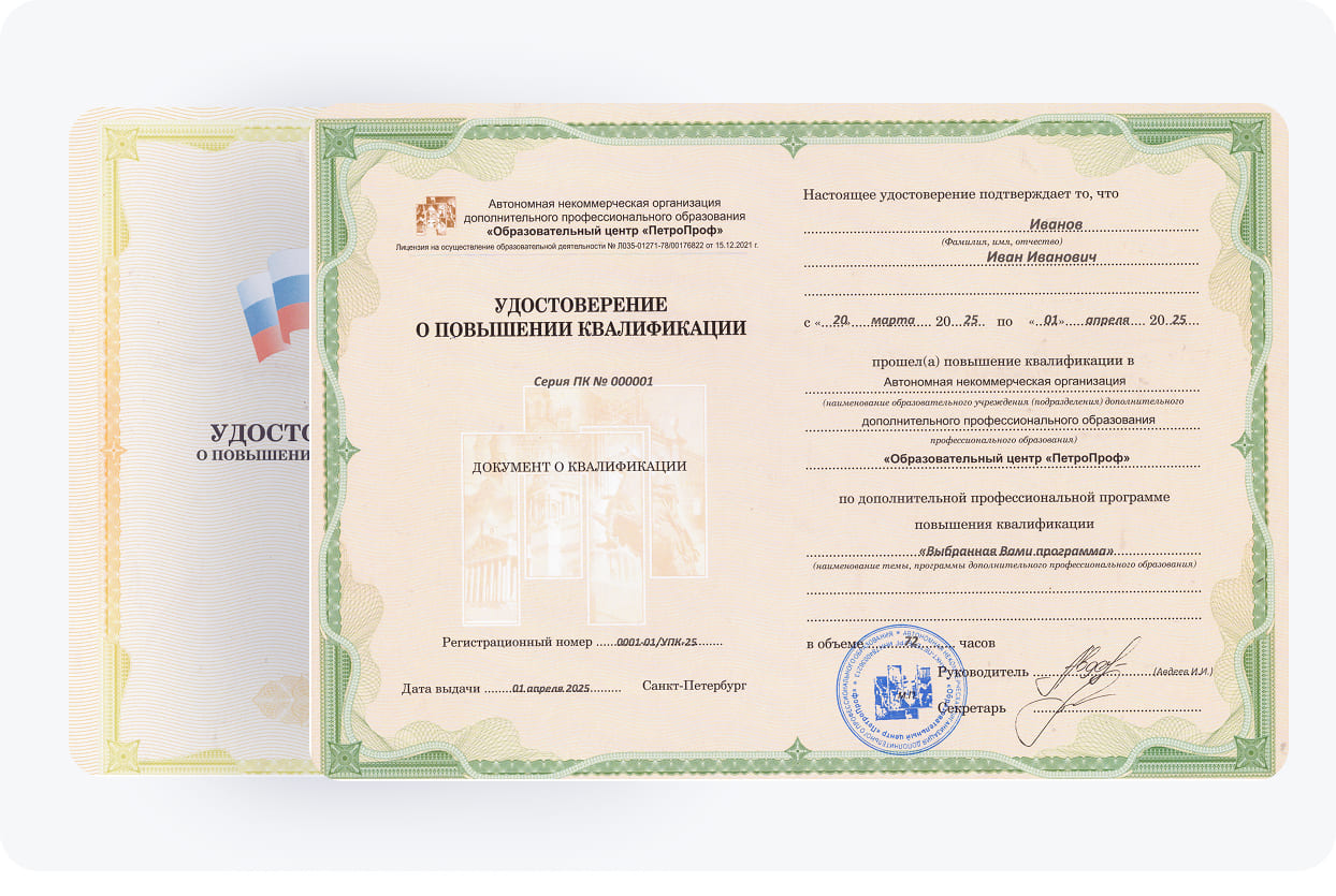 По завершении программы каждый участник получит удостоверение о повышении квалификации (УПК), подтверждающее прохождение курсов и дающее право дальнейшего ведения проф.деятельности. Обучение разработано ведущими специалистами отрасли и соответствуют требованиям Федерального государственного образовательного стандарта.